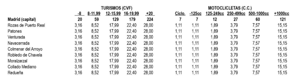 En la siguiente tabla se puede observar lo que se paga en Collado Mediano y otros municipios madrileños incluidos en esta lista, en comparación con lo que se paga por el IVTM en Madrid capital. Estas cifras, expresadas en euros, ya aplican las bonificaciones disponibles a las cuotas base establecidas en cada municipio.